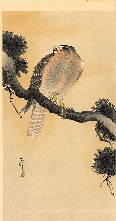 Wir bieten Ihnen eine handgefertigte Reproduktion auf Leinwand des berühmten Kunstwerks 'Falcon auf einem Zweig' von Ohara Koson, aus dem Reproduktionsmuseum.