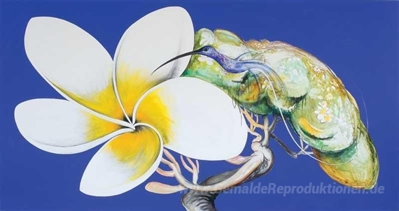 Wir bieten Ihnen eine handgefertigte Reproduktion auf Leinwand des berühmten Kunstwerks 'Frangipani und Humming Bird - Japanisch: Sommer' von Brett Whiteley, aus dem Reproduktionsmuseum.