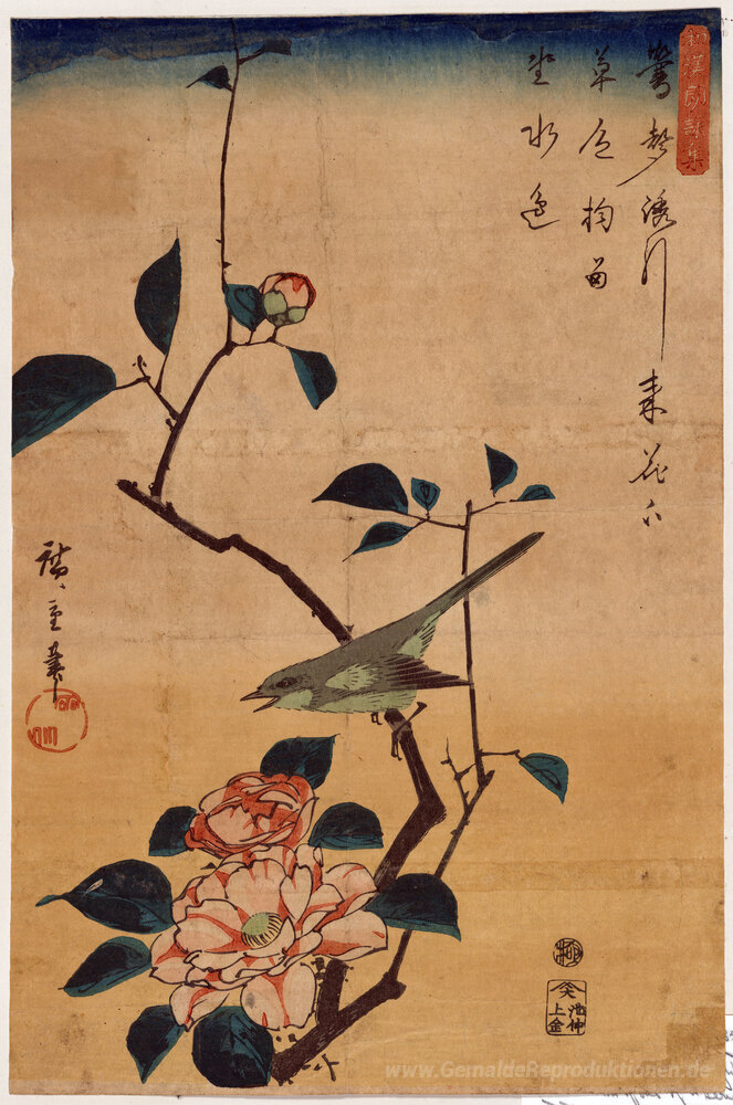 Wir bieten Ihnen eine handgefertigte Reproduktion auf Leinwand des berühmten Kunstwerks 'Kamelie und Bush-Trällerer' von Hiroshige, aus dem Reproduktionsmuseum.