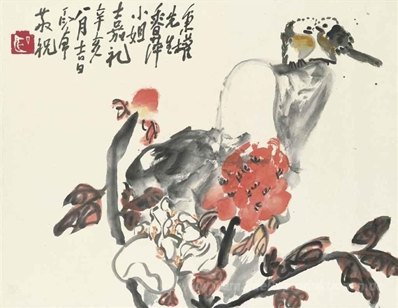 Wir bieten Ihnen eine handgefertigte Reproduktion auf Leinwand des berühmten Kunstwerks 'Lovebirds' von Ding Yanyong, aus dem Reproduktionsmuseum.