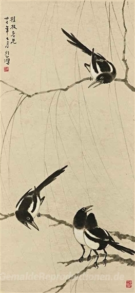 Wir bieten Ihnen eine handgefertigte Reproduktion auf Leinwand des berühmten Kunstwerks 'Magpies' von Xu Beihong, aus dem Reproduktionsmuseum.