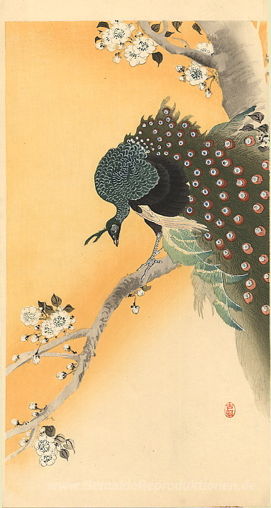 Wir bieten Ihnen eine handgefertigte Reproduktion auf Leinwand des berühmten Kunstwerks 'Pfau' von Ohara Koson, aus dem Reproduktionsmuseum.