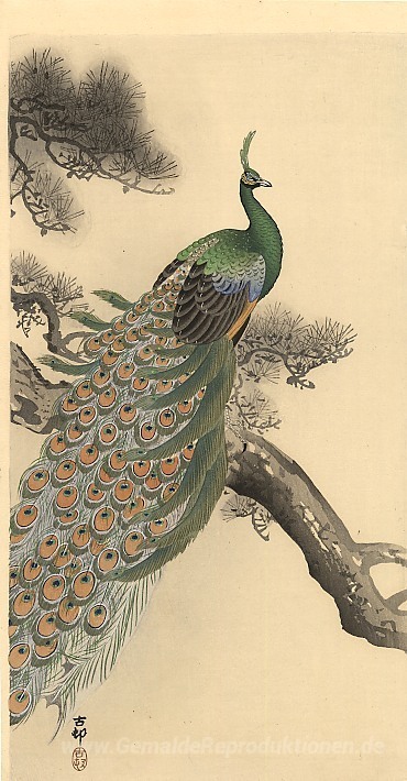 Wir bieten Ihnen eine handgefertigte Reproduktion auf Leinwand des berühmten Kunstwerks 'Pfau' von Ohara Koson, aus dem Reproduktionsmuseum.