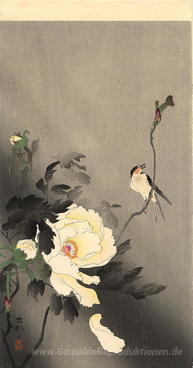 Wir bieten Ihnen eine handgefertigte Reproduktion auf Leinwand des berühmten Kunstwerks 'Schlucken Sie mit Pfingstrosen' von Ohara Koson, aus dem Reproduktionsmuseum.