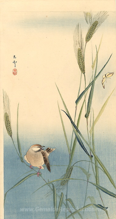 Wir bieten Ihnen eine handgefertigte Reproduktion auf Leinwand des berühmten Kunstwerks 'Songbird auf Barley Stalk' von Ohara Koson, aus dem Reproduktionsmuseum.