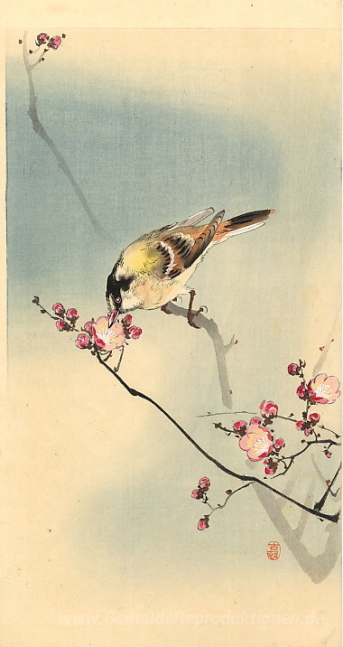 Wir bieten Ihnen eine handgefertigte Reproduktion auf Leinwand des berühmten Kunstwerks 'Songbird auf Pflaumenblüte' von Ohara Koson, aus dem Reproduktionsmuseum.