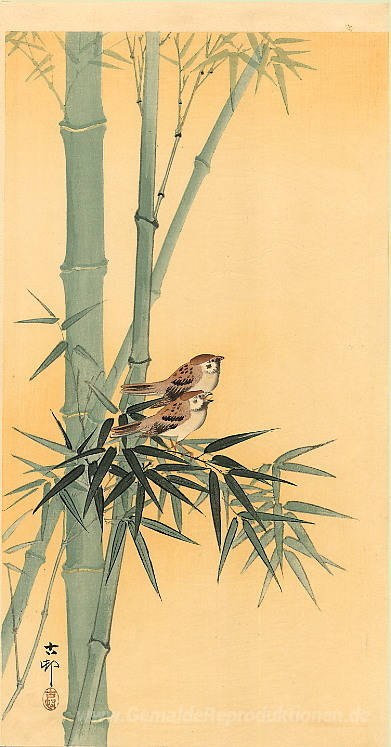 Wir bieten Ihnen eine handgefertigte Reproduktion auf Leinwand des berühmten Kunstwerks 'Spatzen auf Bambus-Baum' von Ohara Koson, aus dem Reproduktionsmuseum.