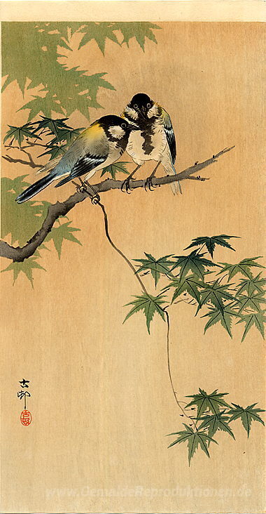 Wir bieten Ihnen eine handgefertigte Reproduktion auf Leinwand des berühmten Kunstwerks 'Titten auf Maple' von Ohara Koson, aus dem Reproduktionsmuseum.