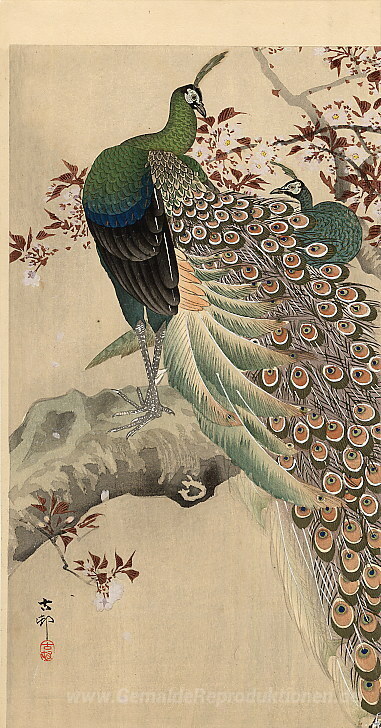 Wir bieten Ihnen eine handgefertigte Reproduktion auf Leinwand des berühmten Kunstwerks 'Zwei grüne Pfauen auf dem Ast eines blühenden Baum' von Ohara Koson, aus dem Reproduktionsmuseum.