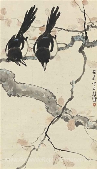 Willkommen in der faszinierenden Welt der Ölgemälde, wo jeder Pinselstrich eine Geschichte erzählt. Eines unserer herausragenden Werke ist Zwei Vögel, geschaffen von dem renommierten chinesischen Künstler Xu Beihong. Er ist bekannt für seine meisterhafte Technik und die Fähigkeit, Emotionen durch lebendige Farben und dynamische Kompositionen auszudrücken. In Zwei Vögel kombiniert er traditionelle chinesische Maltechniken mit westlichen Einflüssen, um eine harmonische Einheit zu schaffen, die der Betrachter sofort spürt.