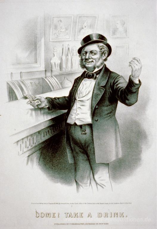 Wir bieten Ihnen eine handgefertigte Reproduktion auf Leinwand des berühmten Kunstwerks 'Kommen! Nehmen Sie einen Drink' von Currier and Ives, aus dem Reproduktionsmuseum.