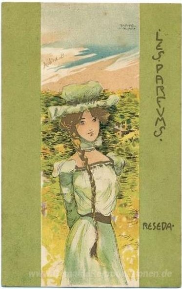 Wir bieten Ihnen eine handgefertigte Reproduktion auf Leinwand des berühmten Kunstwerks 'Parfums' von Raphael Kirchner, aus dem Reproduktionsmuseum.