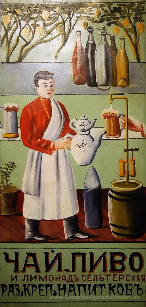 Wir bieten Ihnen eine handgefertigte Reproduktion auf Leinwand des berühmten Kunstwerks 'Tee, Limonade, Bier und Schnaps Getränke' von Niko Pirosmani, aus dem Reproduktionsmuseum.