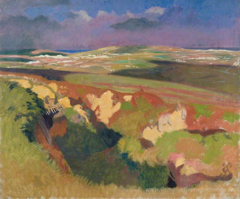 Diese künstlerische Herangehensweise kombiniert mit einer außergewöhnlichen Farbpalette ermöglicht es Blick von der Alten britischen Trenches- Blick in Richtung La Bo, jeden Raum in eine Oase der Inspiration und Ruhe zu verwandeln. Der Ausdruck von Tiefe und Raum vermittelt den Betrachtern das Gefühl, als wären sie Teil der dargestellten Szenerie. Entdecken Sie die transformative Kraft von Ölgemälden und finden Sie das perfekte Kunstwerk, um Ihre persönliche Atmosphäre zu bereichern.