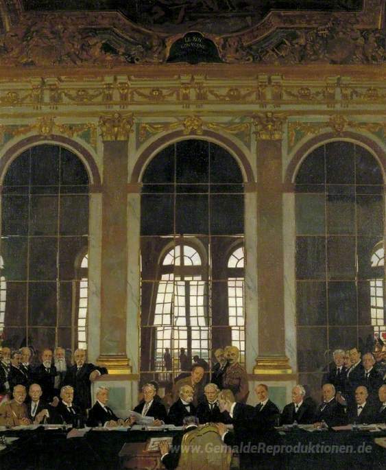 Wir bieten Ihnen eine handgefertigte Reproduktion auf Leinwand des berühmten Kunstwerks 'Die Unterzeichnung des Friedens in der Halle der Spiegel, Versai' von William Orpen, aus dem Reproduktionsmuseum.
