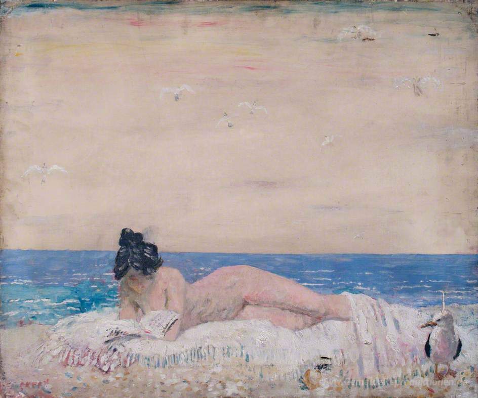 Wir bieten Ihnen eine handgefertigte Reproduktion auf Leinwand des berühmten Kunstwerks 'Nude Female Model (Lesen auf dem Seashore) 1930' von William Orpen, aus dem Reproduktionsmuseum.