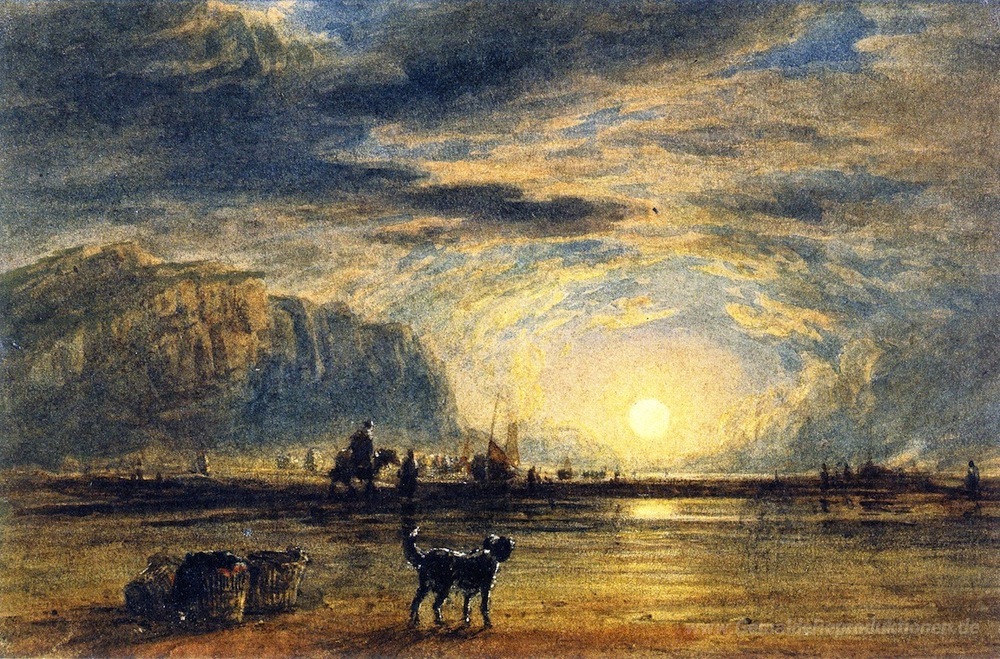 Wir bieten Ihnen eine handgefertigte Reproduktion auf Leinwand des berühmten Kunstwerks 'Beach Scene - Sonnenaufgang' von David Cox, aus dem Reproduktionsmuseum.
