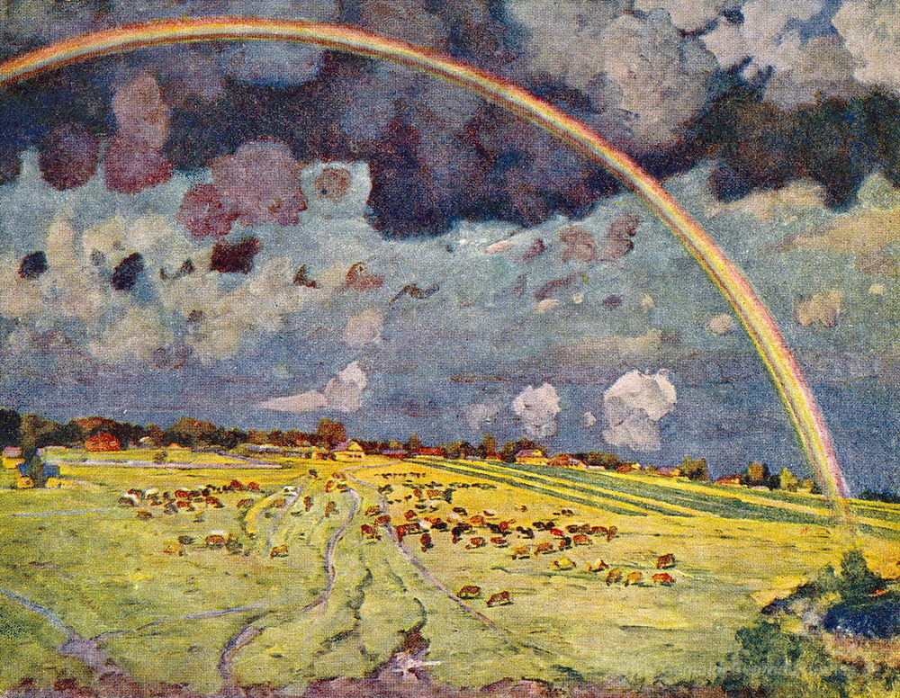 Wir bieten Ihnen eine handgefertigte Reproduktion auf Leinwand des berühmten Kunstwerks 'Regenbogen. Ligachevo' von Konstantin Yuon, aus dem Reproduktionsmuseum.