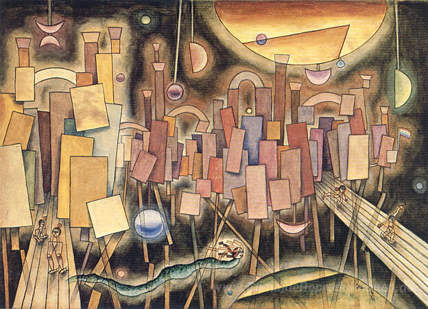 Wir bieten Ihnen eine handgefertigte Reproduktion auf Leinwand des berühmten Kunstwerks 'Palacio Almi' von Xul Solar, aus dem Reproduktionsmuseum.