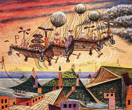 Wir bieten Ihnen eine handgefertigte Reproduktion auf Leinwand des berühmten Kunstwerks 'Vuel Villa' von Xul Solar, aus dem Reproduktionsmuseum.