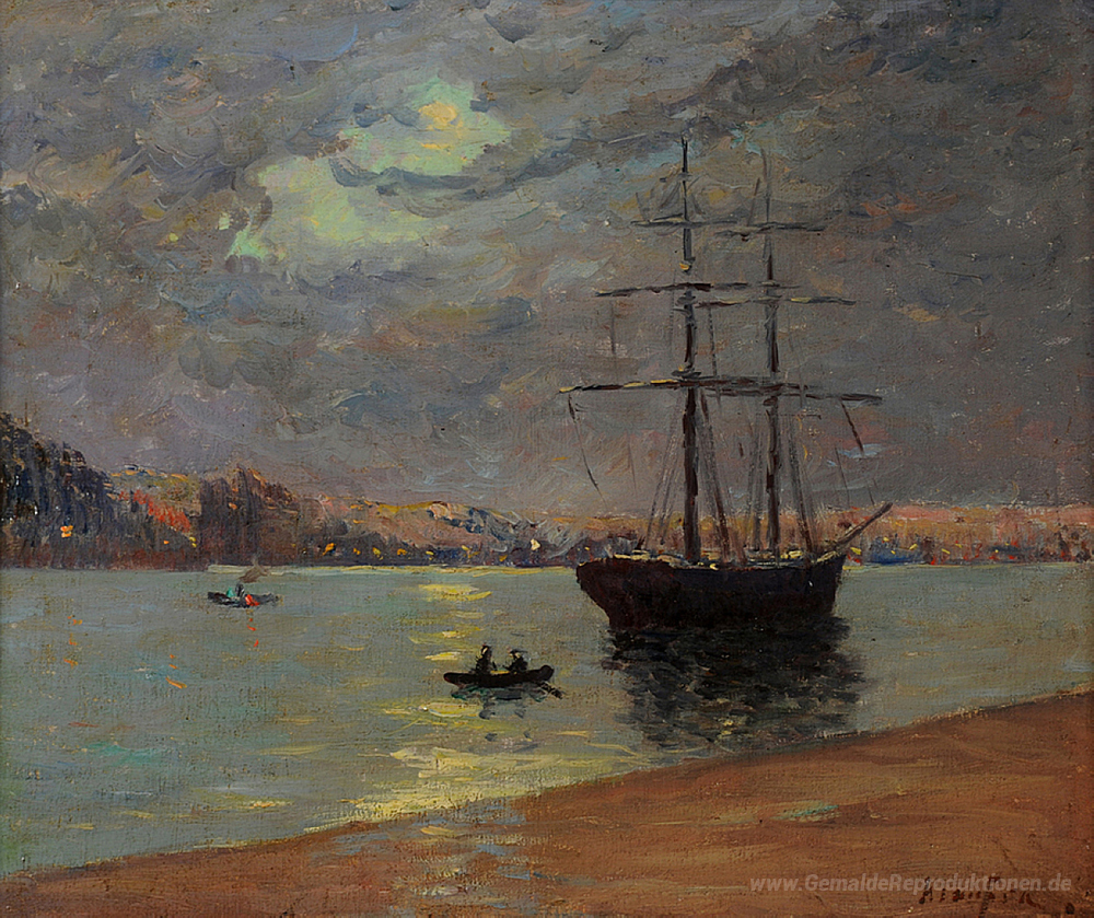 Wir bieten Ihnen eine handgefertigte Reproduktion auf Leinwand des berühmten Kunstwerks 'Abendnebel über Nantes' von Maxime Maufra, aus dem Reproduktionsmuseum.