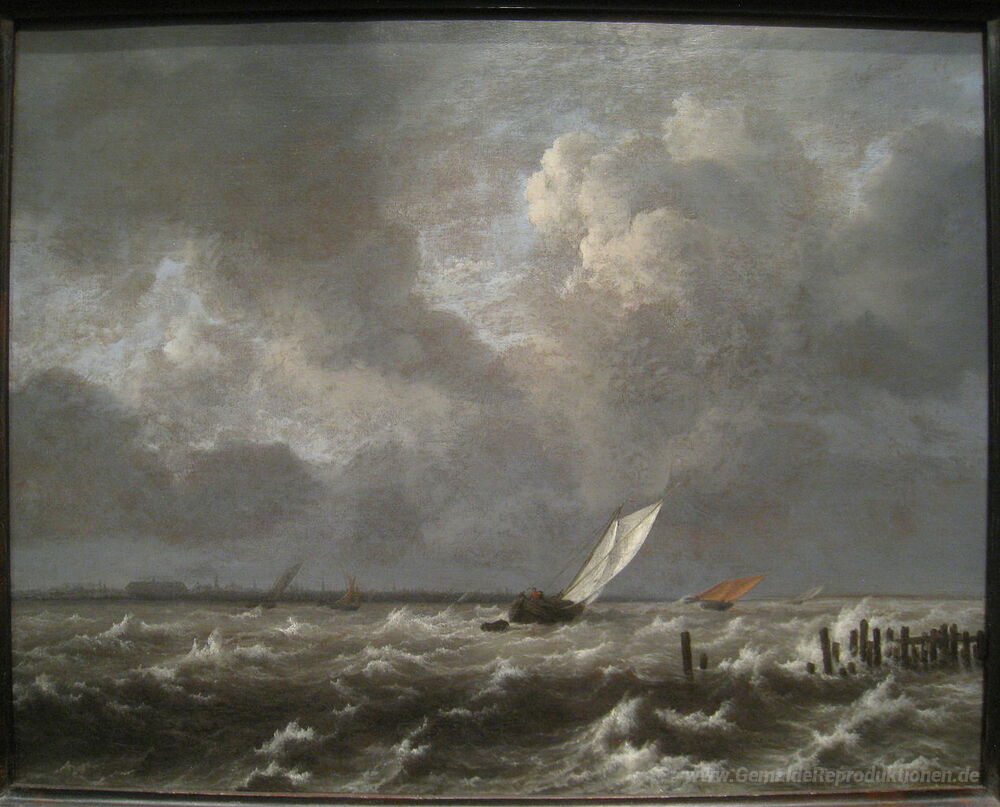 Wir bieten Ihnen eine handgefertigte Reproduktion auf Leinwand des berühmten Kunstwerks 'Ansicht des Ij an einem stürmischen Tag' von Jacob Isaakszoon van Ruisdael, aus dem Reproduktionsmuseum.