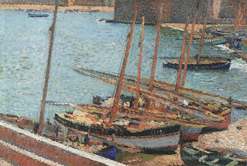Wir bieten Ihnen eine handgefertigte Reproduktion auf Leinwand des berühmten Kunstwerks 'Boote im Hafen von Collioure' von Henri Martin, aus dem Reproduktionsmuseum.