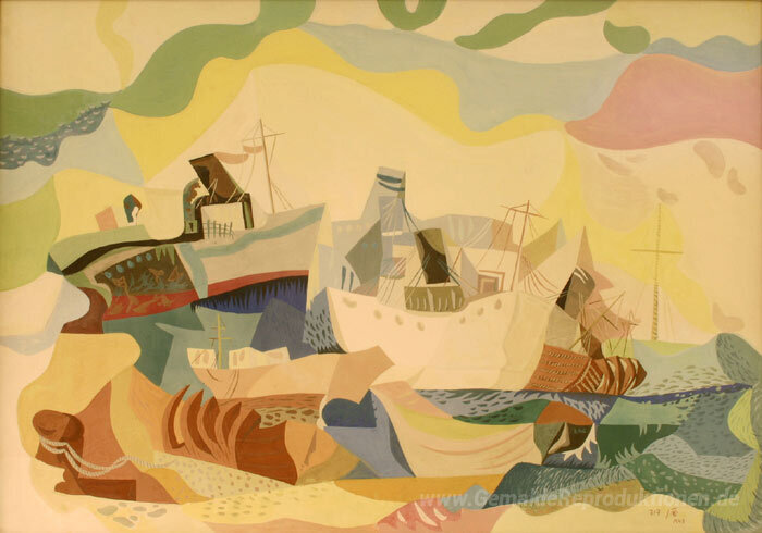Wir bieten Ihnen eine handgefertigte Reproduktion auf Leinwand des berühmten Kunstwerks 'Boote jüdischer Einwanderer (Hamaapilim)' von Jean David, aus dem Reproduktionsmuseum.