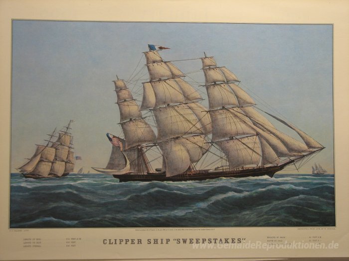 Wir bieten Ihnen eine handgefertigte Reproduktion auf Leinwand des berühmten Kunstwerks 'Clipper Ship 'Gewinnspiel'' von Currier and Ives, aus dem Reproduktionsmuseum.