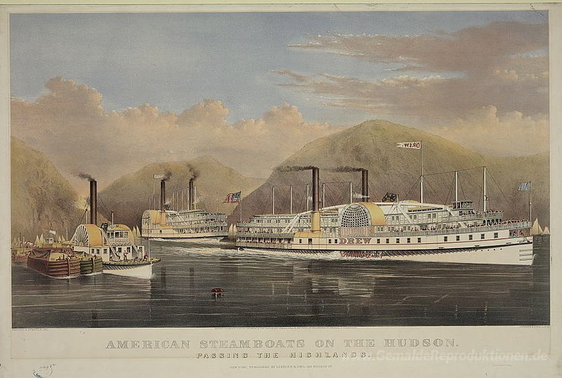 Wir bieten Ihnen eine handgefertigte Reproduktion auf Leinwand des berühmten Kunstwerks 'Dampfschiffe vorbei auf dem Hudson River' von Currier and Ives, aus dem Reproduktionsmuseum.