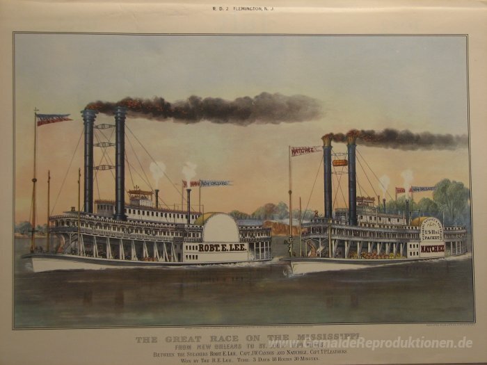 Wir bieten Ihnen eine handgefertigte Reproduktion auf Leinwand des berühmten Kunstwerks 'Das große Rennen auf dem Mississippi' von Currier and Ives, aus dem Reproduktionsmuseum.