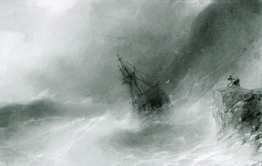 Wir bieten Ihnen eine handgefertigte Reproduktion auf Leinwand des berühmten Kunstwerks 'Das Schiff auf den Felsen geworfen' von Ivan Aivazovsky, aus dem Reproduktionsmuseum.