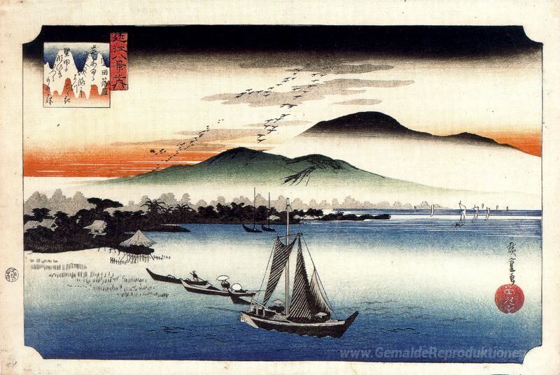 Die Kunstwerke von Hiroshige zeichnen sich durch eine Kombination aus traditioneller Technik und innovativen Ansätzen aus, wodurch sie zeitlos und zugleich modern wirken. Descending Geese, Katata ist nicht nur ein Augenschmaus, sondern auch ein Ausdruck der Verbindung zwischen Mensch und Natur. Dieses exquisite Ölgemälde kann die Stimmung eines Raumes enorm bereichern und ihm eine behagliche, gleichzeitig inspirierende Ausstrahlung verleihen. Lassen Sie sich von der Kunst Hiroshiges verzaubern und bringen Sie ein Stück zeitlose Schönheit in Ihr Zuhause.