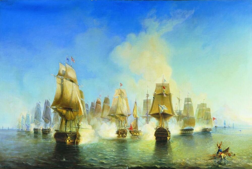 Wir bieten Ihnen eine handgefertigte Reproduktion auf Leinwand des berühmten Kunstwerks 'Die Schlacht von Athos' von Alexey Bogolyubov, aus dem Reproduktionsmuseum.