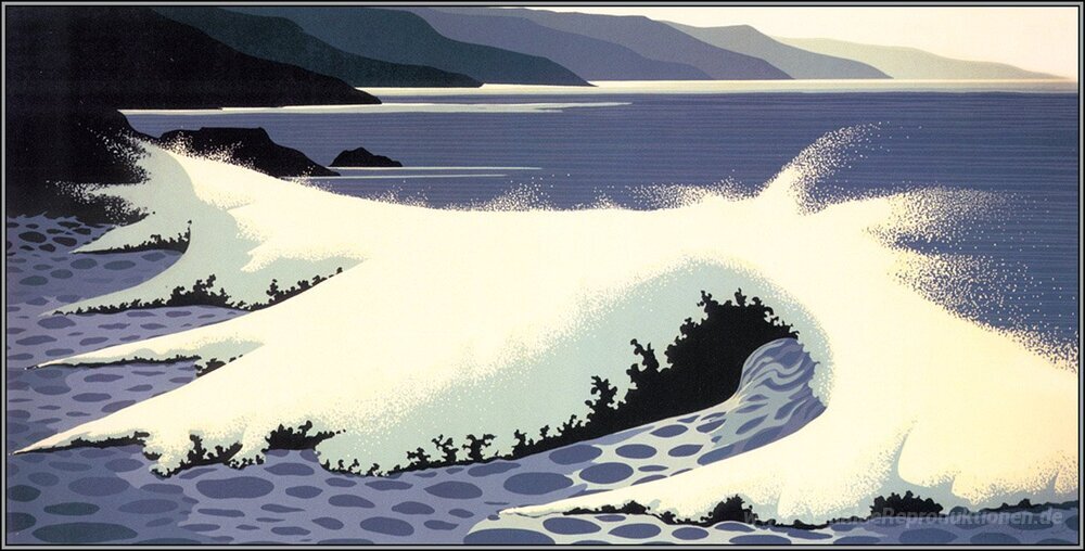 Wir bieten Ihnen eine handgefertigte Reproduktion auf Leinwand des berühmten Kunstwerks 'Die Weiß-Welle' von Eyvind Earle, aus dem Reproduktionsmuseum.