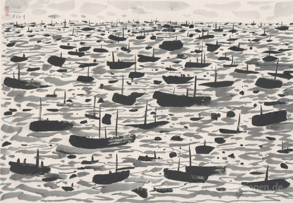 Wir bieten Ihnen eine handgefertigte Reproduktion auf Leinwand des berühmten Kunstwerks 'Ein Fischereihafen' von Wu Guanzhong, aus dem Reproduktionsmuseum.