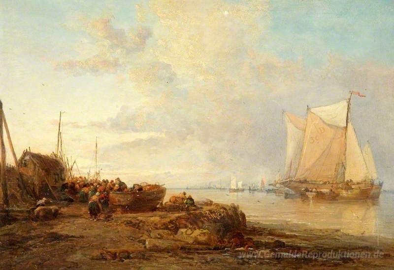 Wir bieten Ihnen eine handgefertigte Reproduktion auf Leinwand des berühmten Kunstwerks 'Entladen niederländischen Fischerboote' von James Webb , aus dem Reproduktionsmuseum.