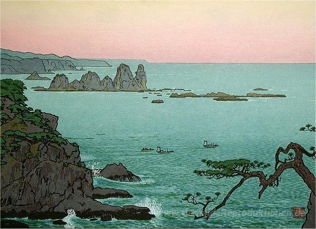 Wir bieten Ihnen eine handgefertigte Reproduktion auf Leinwand des berühmten Kunstwerks 'Irozaki, Morgen' von Toshi Yoshida, aus dem Reproduktionsmuseum.
