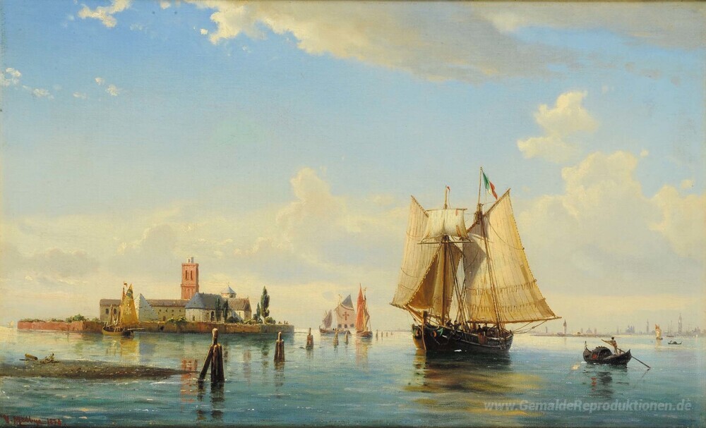 Wir bieten Ihnen eine handgefertigte Reproduktion auf Leinwand des berühmten Kunstwerks 'Laguna di Venezia' von Anton Melbye, aus dem Reproduktionsmuseum.