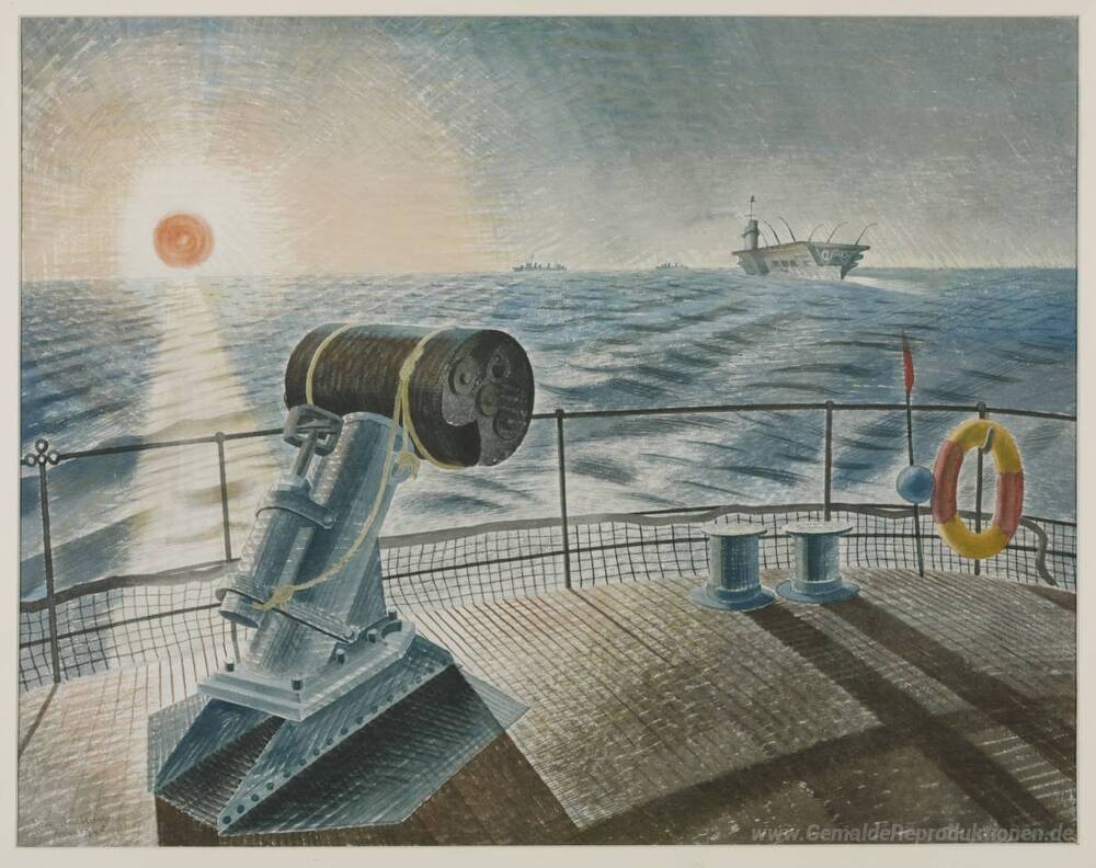 Wir bieten Ihnen eine handgefertigte Reproduktion auf Leinwand des berühmten Kunstwerks 'Mitternachtssonne' von Eric Ravilious, aus dem Reproduktionsmuseum.