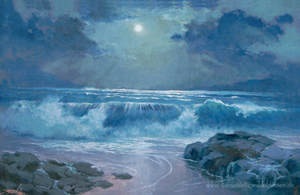 Wir bieten Ihnen eine handgefertigte Reproduktion auf Leinwand des berühmten Kunstwerks 'Mondscheinsonate' von Basuki Abdullah, aus dem Reproduktionsmuseum.