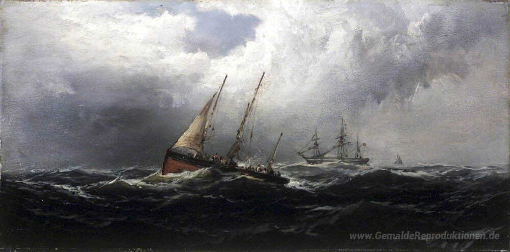 Willkommen in unserer exquisiten Sammlung von Ölgemälden, die Meisterwerke von renommierten Künstlern umfasst. Eines dieser herausragenden Stücke ist Nach einem Sturm - Wreckers von James Hamilton. Hamilton, bekannt für seine eindrucksvollen Landschaftsdarstellungen, vereint in diesem Gemälde seine tiefgreifende Liebe zur Natur und sein außergewöhnliches künstlerisches Gespür. Die Verwendung lebendiger Farben und feiner Details transportiert den Betrachter in das raue, aber zugleich faszinierende Ambiente nach einem Sturm.