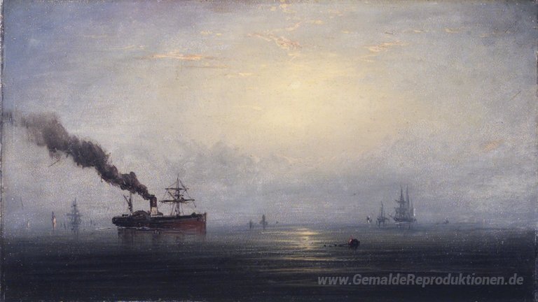 Wir bieten Ihnen eine handgefertigte Reproduktion auf Leinwand des berühmten Kunstwerks 'Nebligen Morgen auf der Themse' von James Hamilton, aus dem Reproduktionsmuseum.