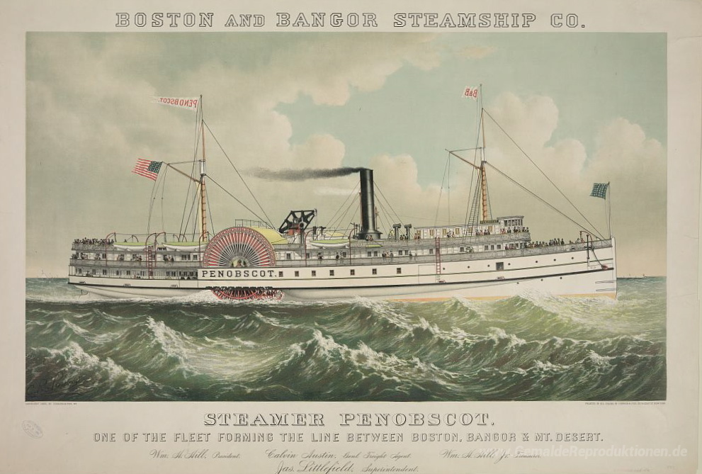 Wir bieten Ihnen eine handgefertigte Reproduktion auf Leinwand des berühmten Kunstwerks 'Penobscot, New England Küstendampfer' von Currier and Ives, aus dem Reproduktionsmuseum.