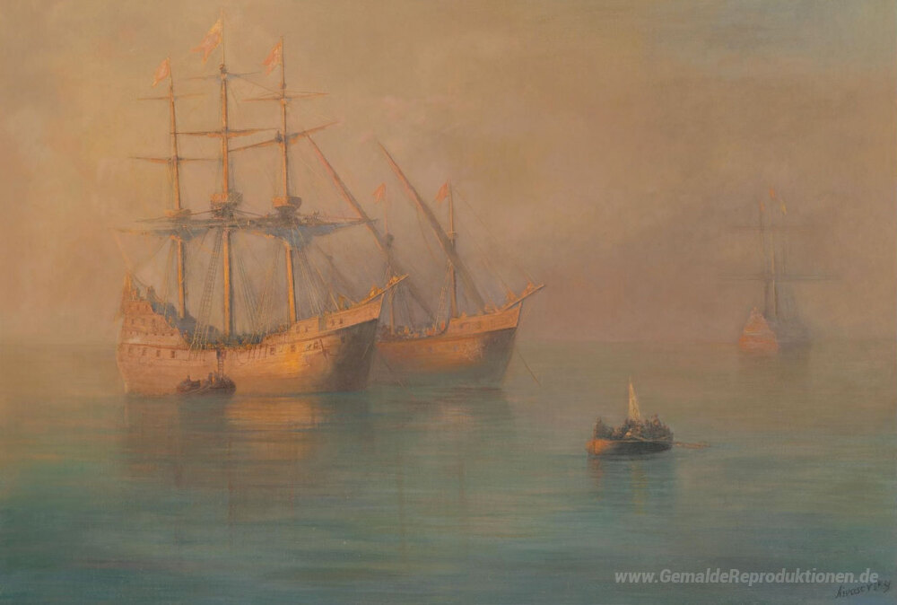 Wir bieten Ihnen eine handgefertigte Reproduktion auf Leinwand des berühmten Kunstwerks 'Schiffe des Kolumbus' von Ivan Aivazovsky, aus dem Reproduktionsmuseum.