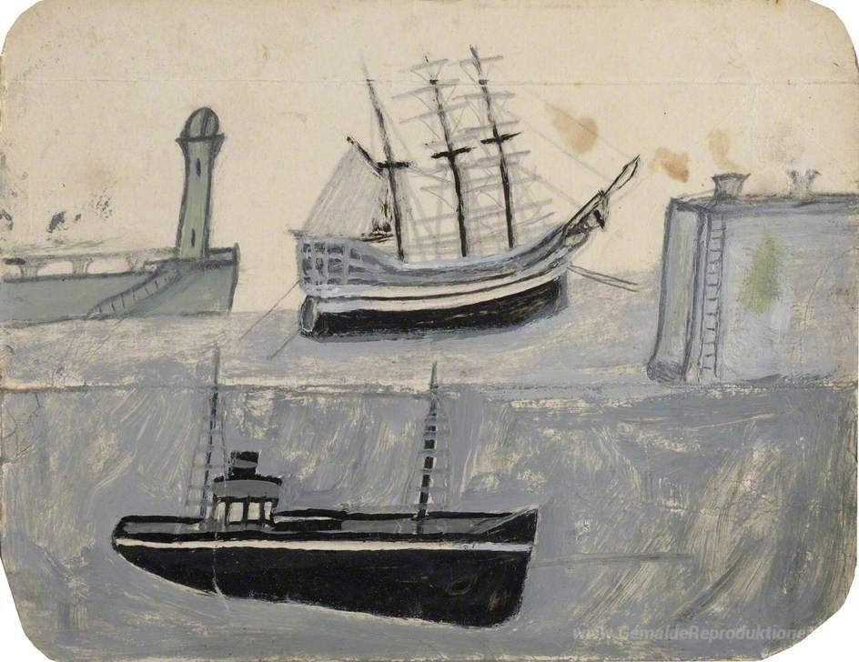 Wir bieten Ihnen eine handgefertigte Reproduktion auf Leinwand des berühmten Kunstwerks 'Schiffe im Hafen' von Alfred Wallis, aus dem Reproduktionsmuseum.