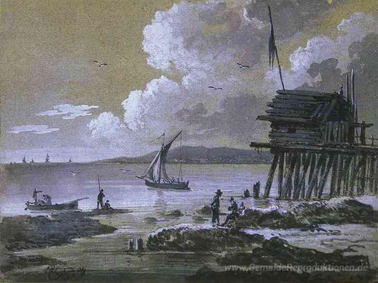 Wir bieten Ihnen eine handgefertigte Reproduktion auf Leinwand des berühmten Kunstwerks 'Seascape At Night' von Alexander Orlowski, aus dem Reproduktionsmuseum.