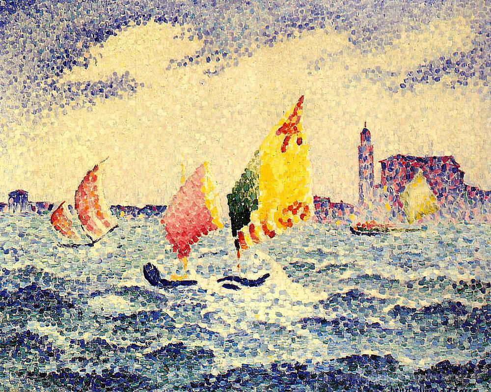 Wir bieten Ihnen eine handgefertigte Reproduktion auf Leinwand des berühmten Kunstwerks 'Segelboote in der Nähe von Chicago' von Henri-Edmond Cross, aus dem Reproduktionsmuseum.