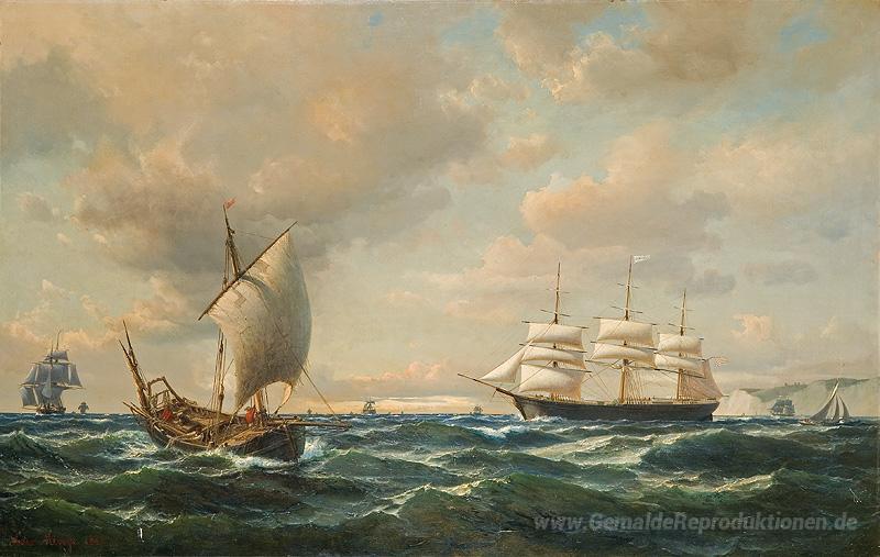 Wir bieten Ihnen eine handgefertigte Reproduktion auf Leinwand des berühmten Kunstwerks 'Segeln vor der englischen Küste' von Anton Melbye, aus dem Reproduktionsmuseum.