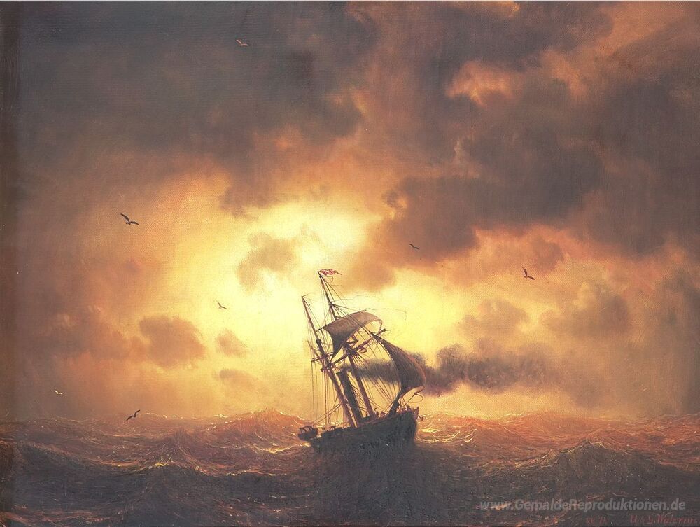 Willkommen in der faszinierenden Welt der Ölgemälde, wo emotionale Tiefe und technische Meisterschaft aufeinandertreffen. Jedes Kunstwerk ist ein einzigartiges Fenster zu den Gedanken und Träumen seines Schöpfers. Entdecken Sie die Werke von Marcus Larson, einem der bemerkenswertesten Künstler des 19. Jahrhunderts, dessen Gemälde Geschichten erzählen und stimmungsvolle Atmosphären schaffen. Sein Meisterwerk Stemship in Sunset fängt die magische Schönheit eines Sonnenuntergangs ein und zieht den Betrachter in seinen Bann.